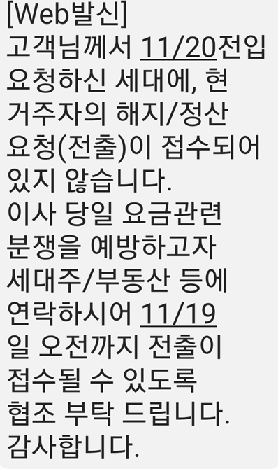 만약 도시가스 전입 신고를 예약했는데, 이전 거주자가 전출신고를 안했다면, (지역명)에너지서비스에서 아래와같이 문자로 안내를 해줍니다. 집주인에게 꼭 연락을 하여 독촉하시기를 바랍니다.