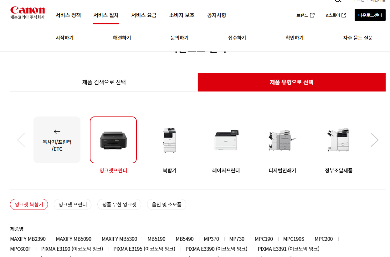 홈페이지에 접속 후 상단 오른쪽의 다운로드센터를 클릭해주세요. 제품 검색 또는 제품 유형 선택하기 화면이 나옵니다. 제품 모델이름을 알면 바로 검색하면됩니다. 제품 유형에서는 복합기/프린터/기타를 클릭해주시고 잉크젯프린터, 복합기, 레이저프린트 등 쓰는 유형을 클릭해서 찾으시면 됩니다.