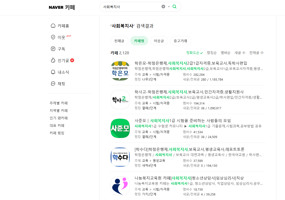 - 네이버 카페 : 사준모, 나눔복지교육원, 행복한사회복지사들의 모임 등