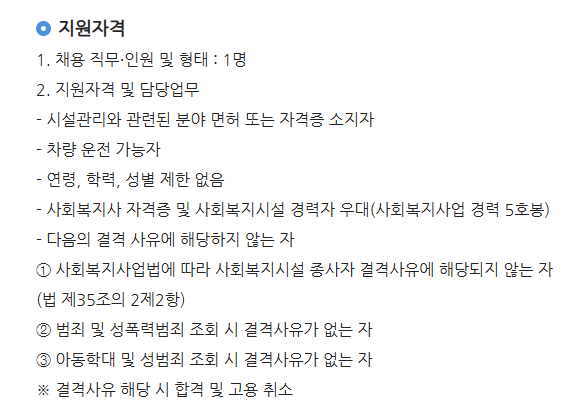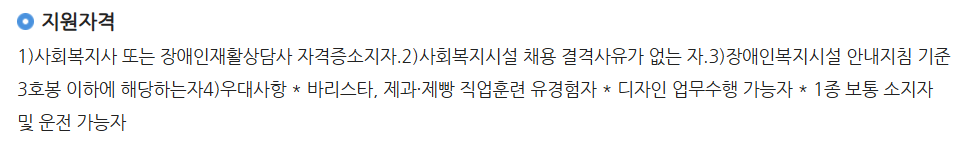 지원자격은 일반적으로 사회복지사 자격증과 운전면허증 소지자면 자격요건이 충분합니다. 여기서 유의해야할점은 실제 차량 운전이 가능해야하며, 시설마다 생산품이 다르기때문에 관련 자격증이나 경험이 있는 사람들을 우대하고 있습니다.