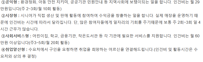 - 지역의 특성에 맞는 공익형, 시장형, 사회서비스형 일자리를 수행한다.